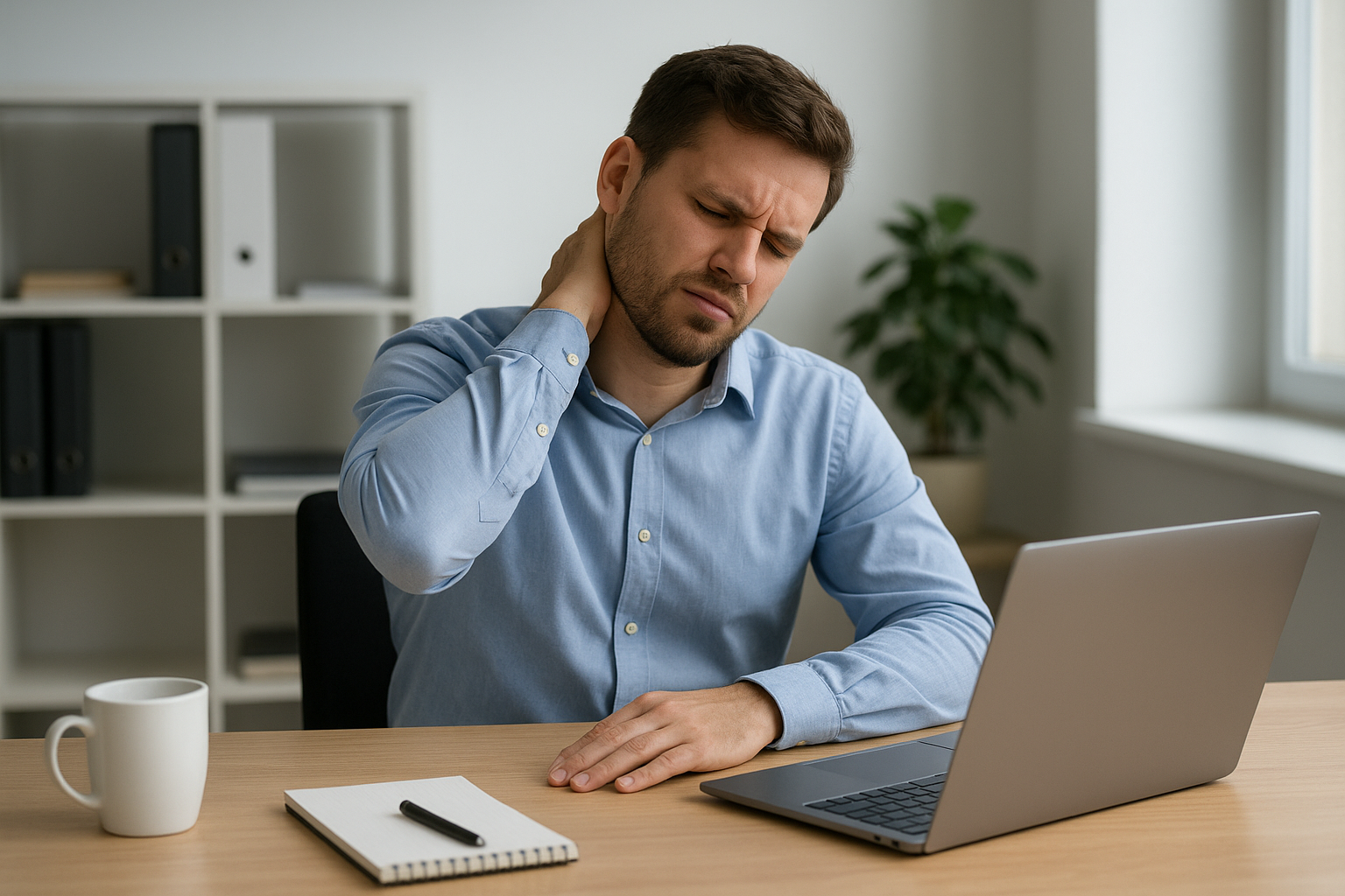 Planifiez une courte pause toutes les heures pour effectuer quelques rotations d’épaules vers l’arrière (tête bien droite, on descend au maximum ses épaules, on les monte vers les oreilles et on rapproche nos omoplates le plus possible). Ce geste simple contribue à corriger la posture penchée vers l’avant et à diminuer les tensions au niveau du cou et du haut du dos.